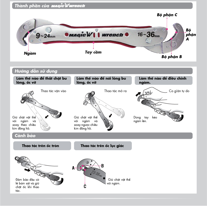 - Có thể thay thế nhiều cờ lê, mỏ lết bằng 1 chiếc cờ lê đa năng Magic Wrench.